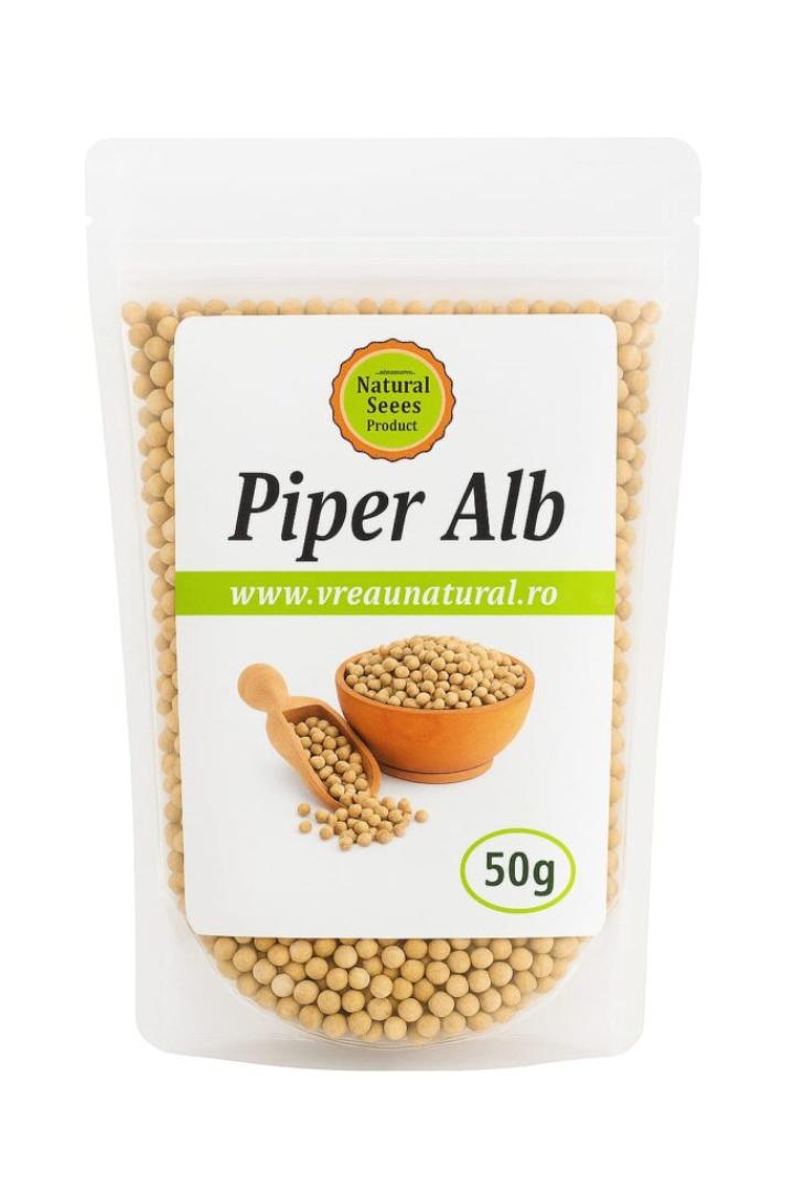 Piperul alb este samanta plantei de piper dupa inlaturarea invelisului inchis la culoare. Procedeul utilizat in acest sens este cel denumit topire industriala prin care fructele de piper rosu sunt inmuiate in apa timp de o saptamana pentru ca invelisul sa se inmoaie si sa cada. Mai apoi se inlatura toate urmele de invelis, iar boabele ramase sunt puse la uscat. Piperul alb este foarte raspandit in bucatariile indiana si mexicana, in sosuri, salate sau piureuri.